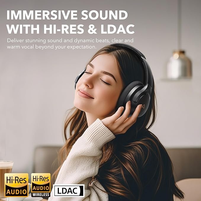 Audio Hi-Res con LDAC: Equipados con drivers de 40 mm que ofrecen alta fidelidad de estudio, transmitiendo sonido claro y detallado desde graves profundos hasta agudos nítidos.