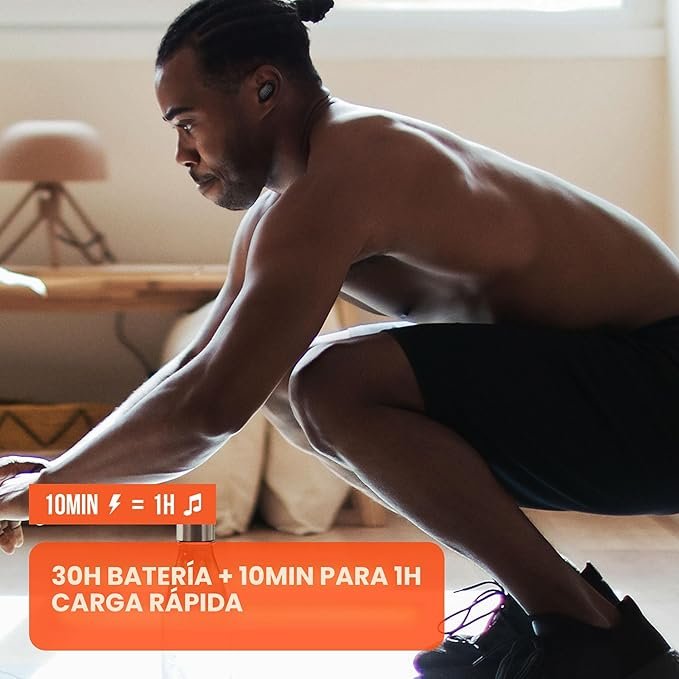 La autonomía es destacable: hasta 10 horas de uso continuo en los auriculares y 20 horas adicionales con el estuche de carga, sumando 30 horas de reproducción total. La función de carga rápida permite obtener varias horas de uso con pocos minutos de carga, asegurando que no interrumpas tus entrenamientos por falta de batería.