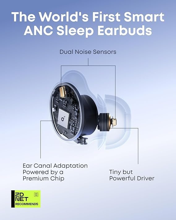 Los Soundcore Sleep A30 son auriculares in-ear diseñados específicamente para mejorar la calidad del sueño. Equipados con cancelación activa de ruido inteligente (ANC), bloquean hasta 30 dB de ruidos molestos, como ronquidos, tráfico y sonidos ambientales, permitiendo un descanso profundo y sin interrupciones.